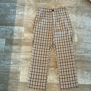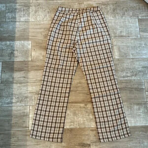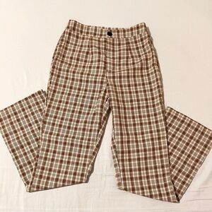 Item: Brown and white plaid wide leg trousers.