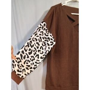 Shien: Brown soft and cozy brown sweater with Cheetah print sleeves and keyhole neck line.