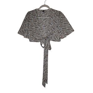 Shein Crop Top Medium Blue Orange Floral Tie Front Deep V Neck Flutter Sleeves