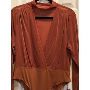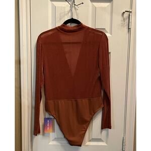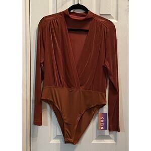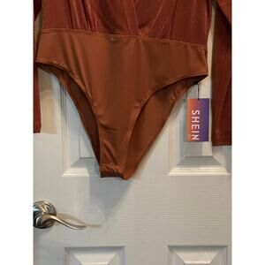 Turn heads with this Shein Curve Deep V Neck Shimmer Bodysuit in a luxe brown coppery shade, plus size 1X. This long-sleeve, figure-hugging bodysuit features dramatic plunge styling, ruched shimmer fabric, mock neck, snap closure, and stretch comfort. Great for layering with jeans, skirts, or suiting. Style for a night out, festivals, parties, or as a glam layering piece. New with tag.