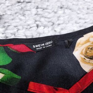 Women's Shein Curve off shoulder crop top in black and red floral pattern. Slight thinning of the fabric near one of the arms as shown in photos. Size 4XL, real measurements shown in photos with top laid flat: