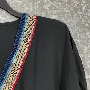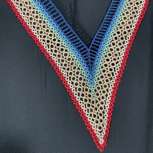 Women's plus size boho chic top by Shein Curve. This black top has a deep v-neck with rainbow crochet trim, short sleeves, and a lightweight feel. It is a polyester spandex blend.