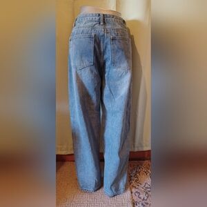 distressed jeans. tags and labels removed. pre-owned denim pants. purple print peek a boo patches. see all pictures. they are part of the description.
