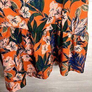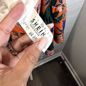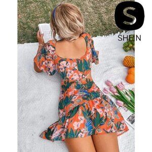 Shein Floral Print Lantern Sleeve Cut Out Asymmetrical Neck Ruffle Hem