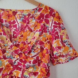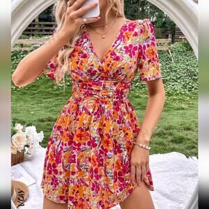 Shein Floral Ruched Waist Pink Multicolor V-Neck Dress Size Medium NWT