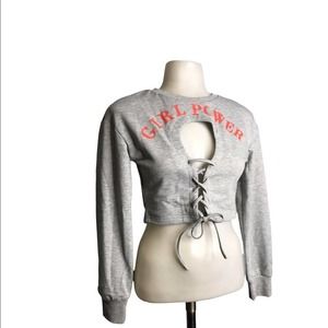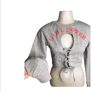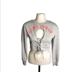 Excellent condition with no flaws, bundle for great discounts and I ship same day! Yes long sleeve gray crop top with pink girl power front graphic cut out front with the lace up waist unique gym or lounge outfit
