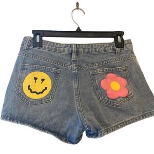 Shein Girls Floral and Cartoon Face Print Denim Shorts - 11-12Y