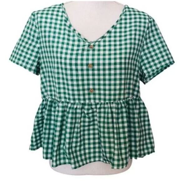 Elevate your spring and summer wardrobe with this pretty green and white plaid top featuring a ruffle bottom, available in a size large. The refreshing combination of green and white adds a touch of natural elegance, perfect for embracing the seasons' vibes. The playful ruffle detail at the bottom enhances the overall charm of the top, creating a stylish and feminine look. This garment is thoughtfully designed for a comfortable fit in a larger size, making it an ideal choice for those seeking both fashion and comfort in their seasonal wardrobe. Embrace a chic and breezy style with this delightful plaid top.