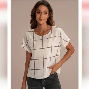 Shein Grid Blouse Rolled Cuff Sleeve Round Neck Size Large