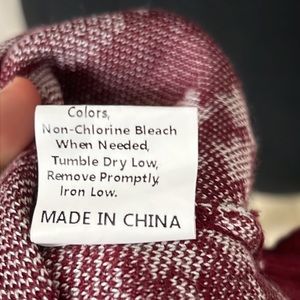 features burgundy and white houndstooth lightweight sweater, ruffle neck hem and cuffs, some stretch