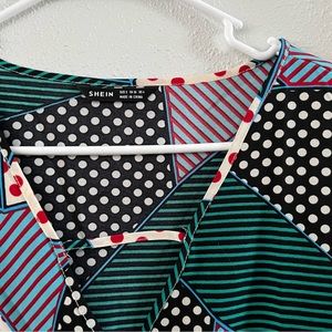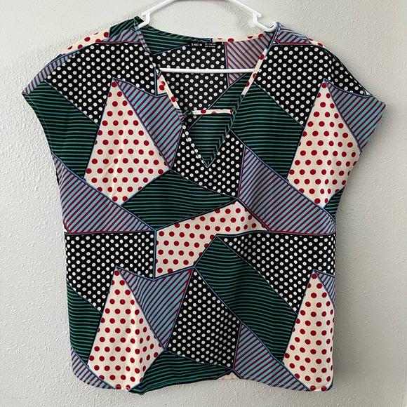 Patchwork top with key neck Cap sleeve Great for layering with a blazer or cardigan