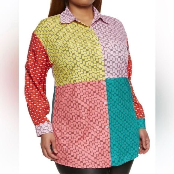 Shein Large Printed Button Down Color-block Lightweight Shirt Approx measurements Pit to Pit 23", Length 30"