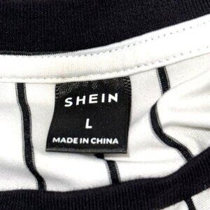 This Shein T-shirt is crafted from a polyester blend, offering a casual yet stylish option for everyday wear. The bold black stripes on a white background are enhanced by a delicate heart embroidery, making it a unique addition to any wardrobe. Machine washable for easy care.