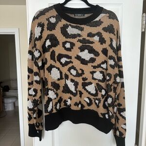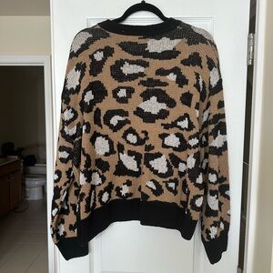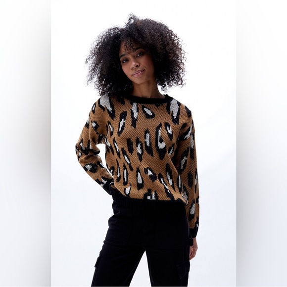 Knit leopard print sweater features a crew neckline, long sleeves, and ribbed trimming. 100% acrylic