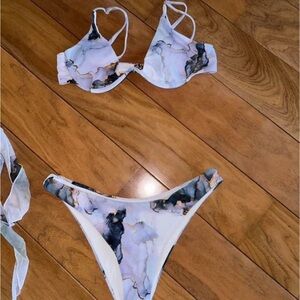 Chic marble print bikini set with matching cover-up. Features a stylish design in shades of blue, black, and white.