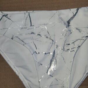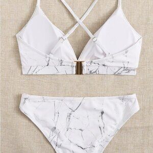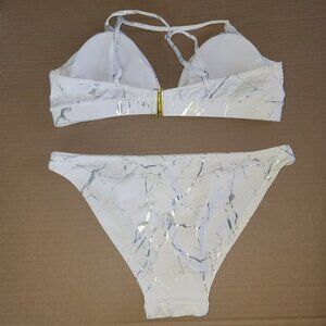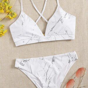 Shein Marble Print Cross Back Bikini Size L White and Silver. Pre-Owned good condition, please see photos for flawed on back closure.