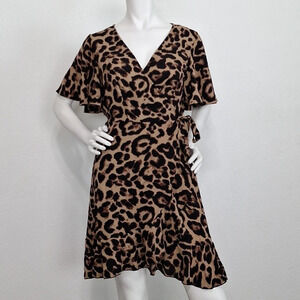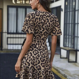 Shein Mobwife Preppy Leopard Print V-Neck Ruffle Self Tie Mini Wrap Dress Size L