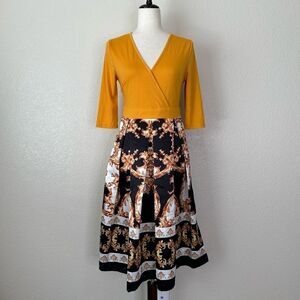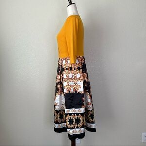 Shein Mustard Yellow Printed Skirt 3/4 Sleeves Midi Dress, Sz Medium