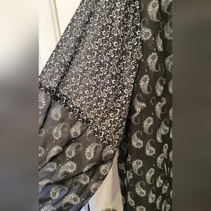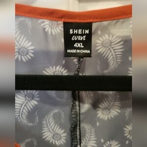 Stylish sheer blouse with orange trim. Features a paisley pattern. Lightweight and elegant.