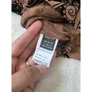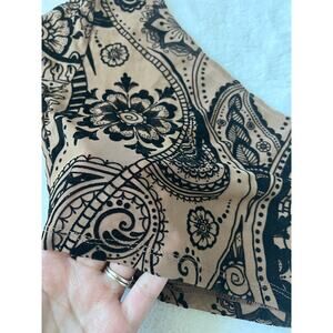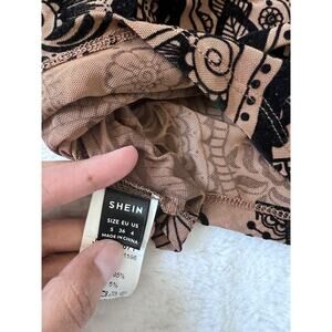 Trendy Shein one-shoulder crop top in a nude and black paisley design. Features one long sleeve and a cropped length for a chic, modern look. Stretchy and comfortable for all-day wear.