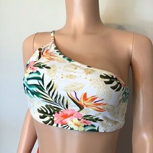 - 2 pc set includes floral, one shoulder bikini top with adjustable strap and removable bra pads. High waisted bottoms with Shirred sides.