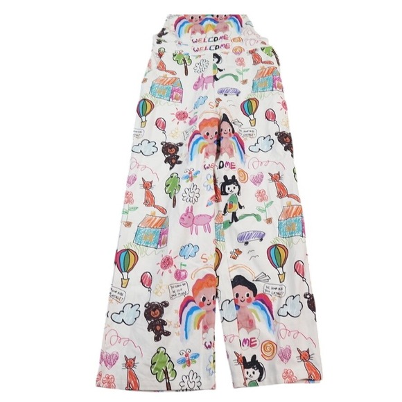 Playful overalls featuring a whimsical doodle print. These overalls showcase adjustable straps for a customizable fit and a unique, eye-catching design. The novelty pattern adds a touch of fun and creativity to the garment, making it a standout piece. The overalls are designed with practicality in mind, offering both style and comfort.