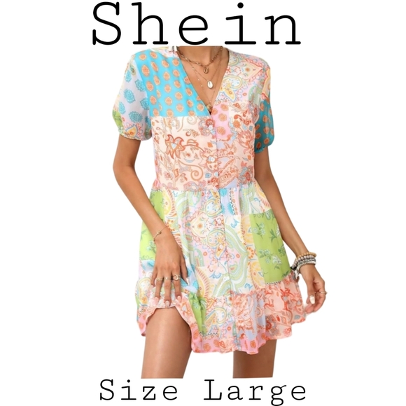 Shein Patchwork Button Down Ruffle Dress