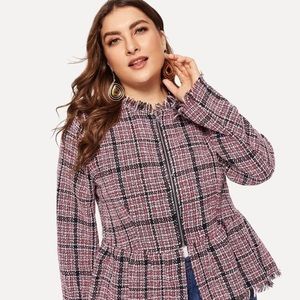 Shein Peplum Frayed Pink/Black/White Multicolor Tweed Zip Jacket Size OXL