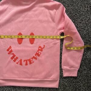 NWOT: Cute and comfy Shein pullover hoodie in pink with orange smiley face graphic and "WHATEVER" text on the back. Soft material, long sleeves, and relaxed fit. Perfect for casual wear, lounging, or layering.