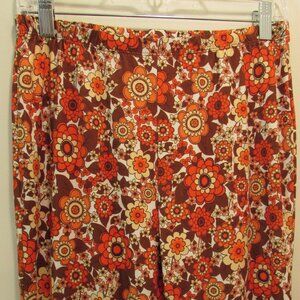 Off white pants with a retro floral print in oranges, yellows, and browns. Very 1960's flower child/hippie.