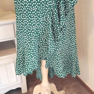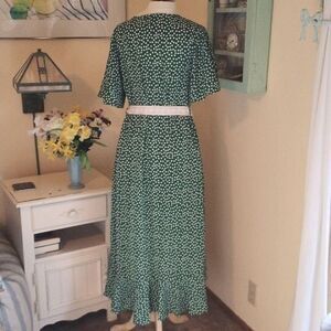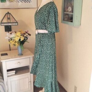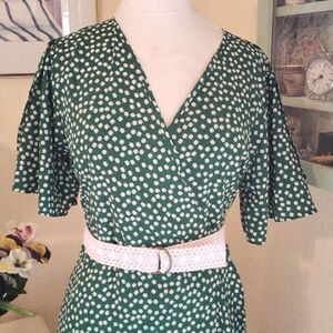 Very retro feel. This green dress has daisies instead of polka dots. Floaty sleeves, wrap front. Seam pat waist. I have provided a lace belt, not original, but it works I think. I FOUND THE OTHER BELT. Matching tie. Floaty skirt, wrap, shorter in front , ruffled all around. Size XL measures 41 at chest, 38 at waist, 44 at hips, 40-50 long from shoulder to hem. A lovely, timeless statement.