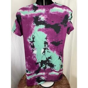 Shein short sleeve graphic tee featuring a bold “Rock Cars Automobile Club” design with classic cars on the front. Unique purple, teal, and black tie dye pattern (front and back). Lightweight stretch fabric, soft feel.