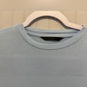 Light-blue short-sleeve tee with adjustable ruched sides and drawstring ties.