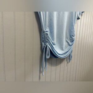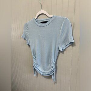 Light-blue short-sleeve tee with adjustable ruched sides and drawstring ties.