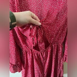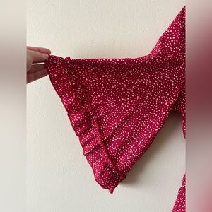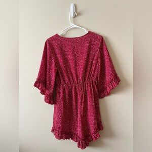 Size M, 100% polyester, ruffled and flared sleeves, keyhole front with tie, cinched waist, deep v-neck