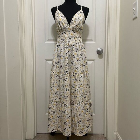 This is a Shein Maxi Dress in a women's size Medium. It has adjustable spaghetti straps and a v-neckline. There is an adjustable tie in the back. Most of the back is otherwise open. The dress is an off white or cream color with a ditsy floral print in yellow and black. The dress is in excellent preowned condition. The dress is about 48" long. Pit to pit is 16" however this is where it ties in the back so there is room for adjustment.