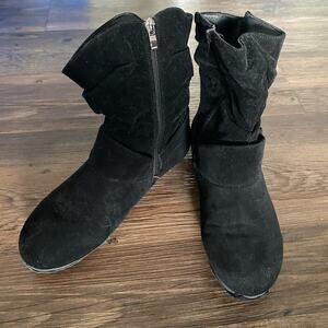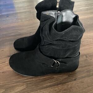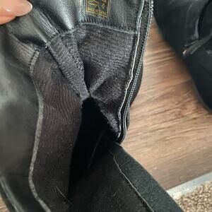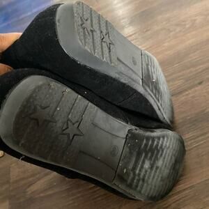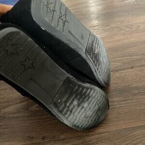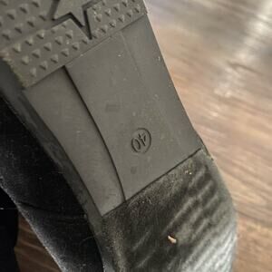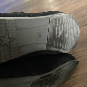Gently used with no flaws. Worn once (Stuck black suede on bottom of shoe for swing dancing) Can peel off to remove.