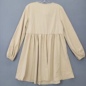 Shein Women's Dress Size S Tan Mini Shirtdress 3% Stretch Preppy Lace Shift Tie V-Neck Classic Long Sleeves Ruffles Lightweight Unlined Y2K