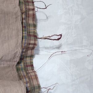 tan tee base with plaid and grey patchwork