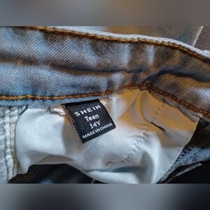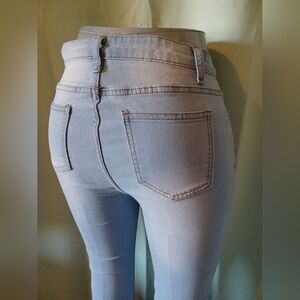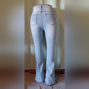 Stylish light blue jeans perfect for any casual outing. Comfortable fit and versatile design make these jeans a wardrobe essential. teen flare denim. high waisted. pre-owned in nice shape with a couple spots. see pictures. they are part of the description. measurements are approximate. no material percentage tag included inside jeans. I included a screenshot of material from the online description from Shein website.