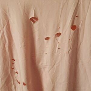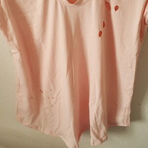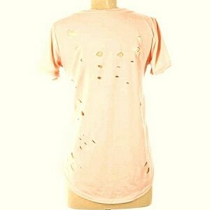 Shein peachy pink t-shirt. Short sleeves, with curated rips on the back and the front. 2 straps cross the chest in the v-neck and u shaped hem for added style. Stretchy poly/spandex blend fabric.