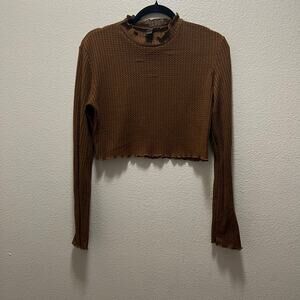 Shein Waffle Knit Brown Long Sleeve Mock Neck Crop Top Scalloped Hem Size Large