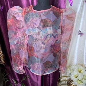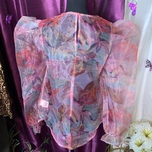 Shein Watercolor Print Semi Sheer Puff Sleeve Shirt, size medium