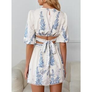 Shein White Plants Print Cut Out Tie Back Lantern Half Sleeve Boho A Line Mini Leisure Vacation Dress Sz S
