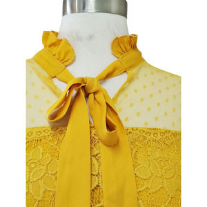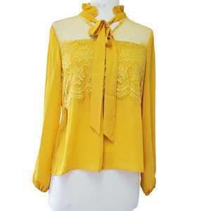 Shein Women's Yellow Floral Long Sleeve Tie Neck Mesh Yoke Blouse Top Size XS