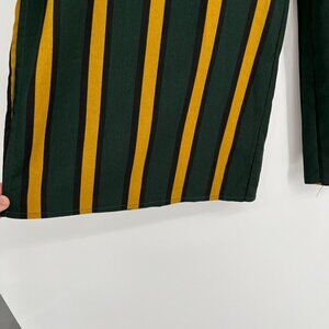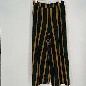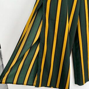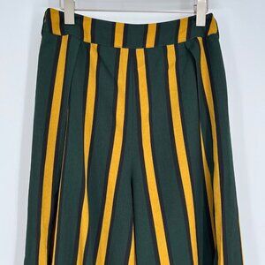 Stylish wide-leg pants featuring bold green and yellow stripes. Comfortable fit for casual or semi-formal occasions.