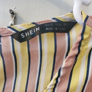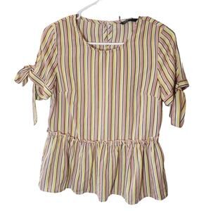 Shein Yellow Pink Striped Short Tie Sleeve Ruffled Peplum Blouse Top Size XS