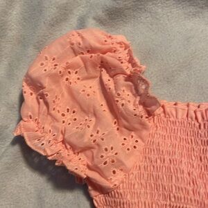 Feature: Square neck, frill, short sleeve, puff sleeve, shirred, eyelet embroidery, womens tops, fashionable