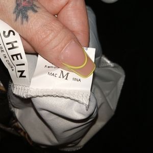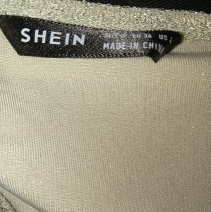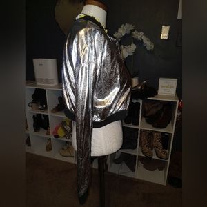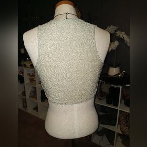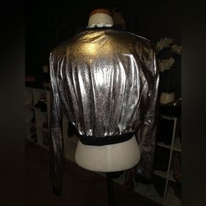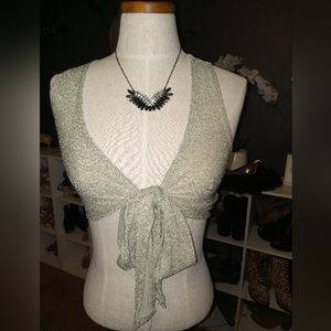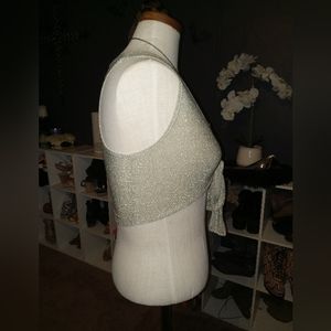 Thin silver cropped jacket (does have some stretch) $15 *comes with yellow and silver chain necklace*, Shein light green shimmer top $10 if bought separately. $15 for Outfit both NEW never worn.