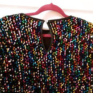 Very sparkly multi-color iridescent sequin and black velvet top - a fun party top! Armpit to armpit is 44"; across the waist is 21"; from shoulder to bottom hem is 23 1/2". Never wore this - it will come in the original Shein bag.